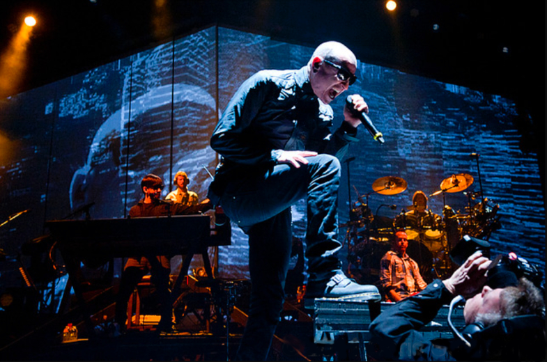 Chevron shaped stage and stage set with articulated vertical louvered panels form