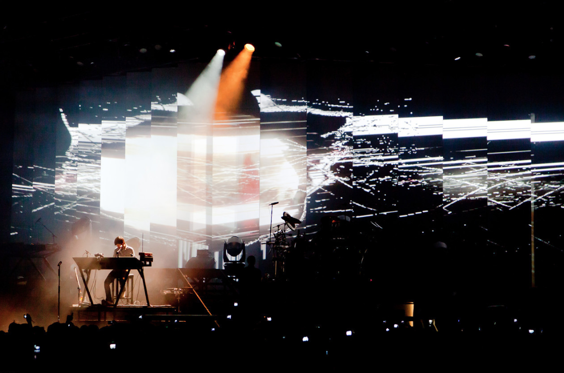 Chevron shaped stage and stage set with articulated vertical louvered panels form